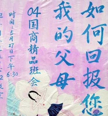2005年5月27日晚6:30,04国商“拿什么报答您,我的父母”精品班会在国际交流中心F2教室准时开始。 |