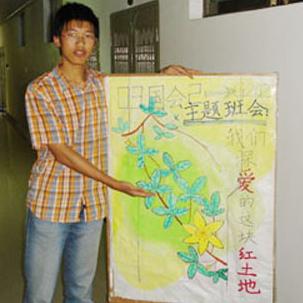 一、班会的前期宣传: 为了做到创新,除了在班会的主题和方式上,我们在宣传上也是下足了功夫。首先是海报上,我们采取了彩画和毛笔字。分别由擅长绘画和毛笔字的同学完成,效果不错,并于4月2 |
